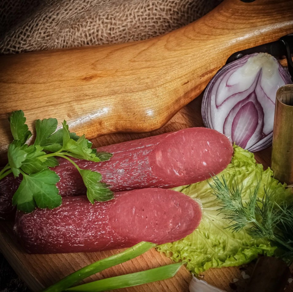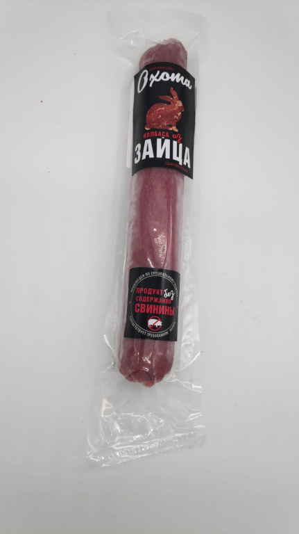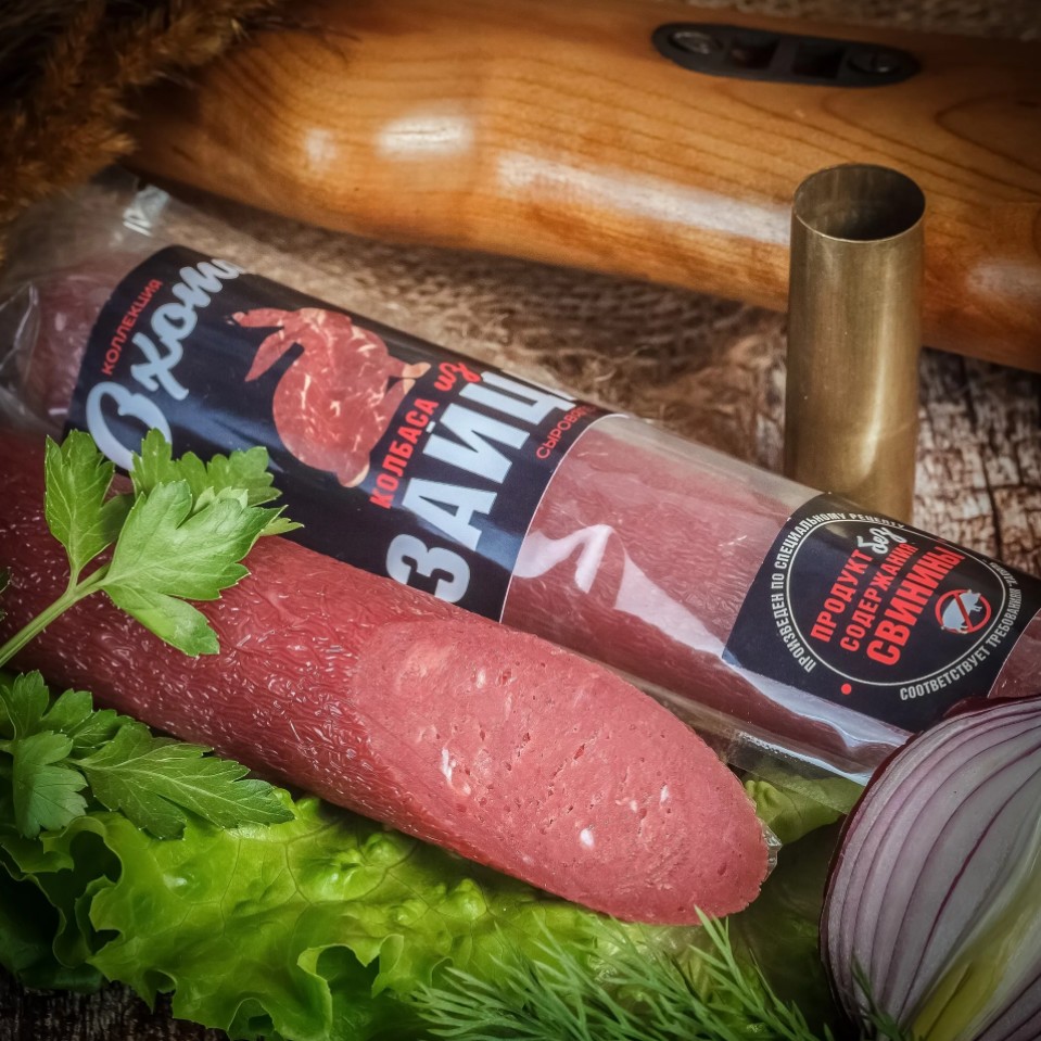 Сыровяленая колбаса из зайца – продукция премиум-класса. Она обладает не только изумительным и нежным вкусом, но и полезными качествами дичи, сохранившимися после процесса вяления. Зайчатина – это источник аминокислот, богата витаминами В12. Колбаса приготовлена из мяса зайца, добытого в экологически чистом районе, и говядины. В качестве ингредиентов используют кориандр, смесь перцев, мускатный орех, тмин, посолочную смесь, натуральный краситель. Сыровяленую колбасу подают на стол в виде нарезки. На блюде в дополнении с веточками зелени и лесными ягодами с кисловатыми нотками она не оставит в стороне любителей дичи.